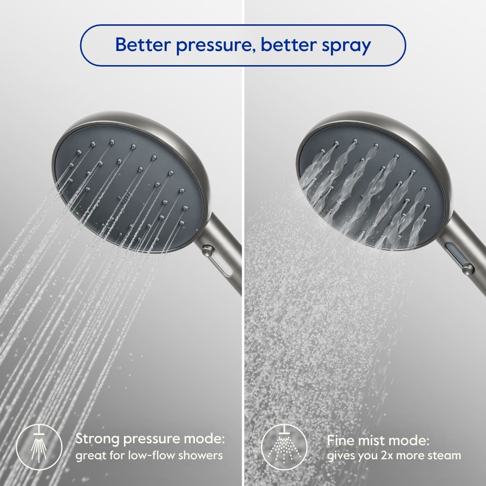Say hai to a smart sustainable showerhead. Water-powered Bluetooth technology connects to the hai app, helping you track your water usage – no batteries required. Save water with customizable LED alerts, indicating when the water’s reached your perfect temperature and when you’re at your set water use target. A specially designed patented spray slider makes it easy to adjust between a high-pressure stream to a steamy fine mist. hai features more coverage than the average showerhead and is perfect for low-flow environments. Constructed with durable, high-quality, stainless-steel materials and a smooth bacterial-resistance hose, hai can be mounted on the wall or used as a handled shower device. A 2-year warranty lets you buy with confidence.